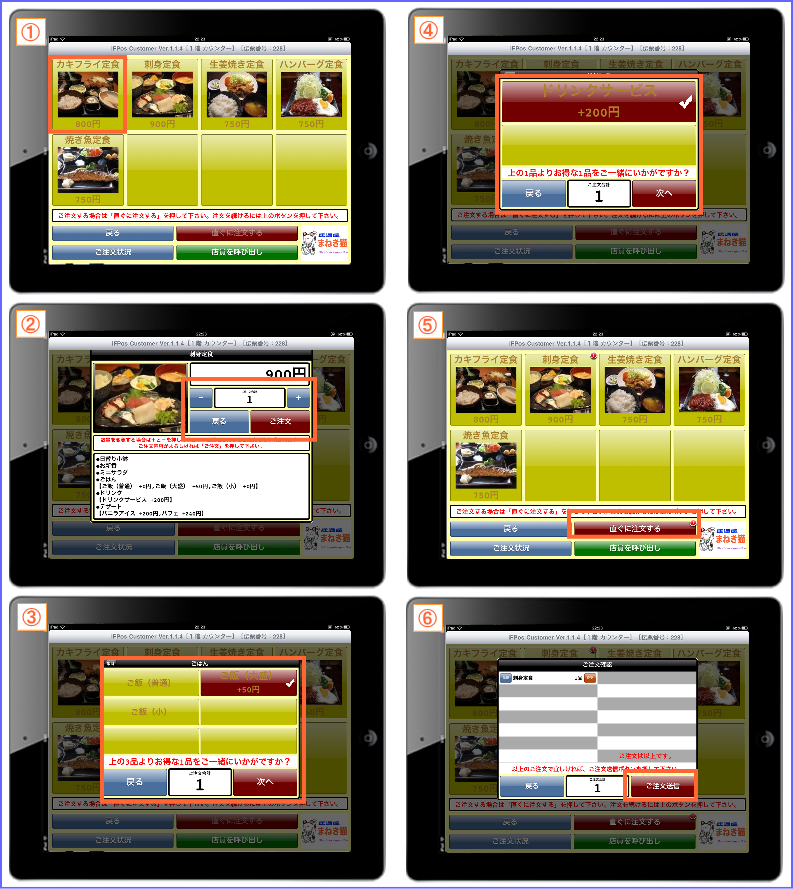 | 注文の操作 | お客様が戸惑わないよう操作性には格段の配慮をしています。 ■ 単品商品の注文操作 ■ ランチなどのセット商品の注文操作 ■ 食べ放題・飲み放題などの時間制限商品の注文操作 ☆ トッピング ( 焼き鳥の塩・タレの選択など ) の選択操作も簡単です。 |